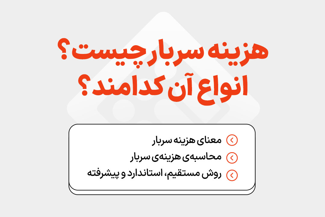 هزینههایی که خارج از مراحل اصلی تولید و خدمات مرتبط با محصول یا خدمات واقعی شرکت هستند، هزینه سربار نامیده میشوند. شامل هزینههایی نظیر مدیریت شرکت، حقوق و دستمزد کارکنان، اجاره و خرید دفتر و تجهیزات، شرکت در نمایشگاهها و کنفرانسهای صنعتی، تبلیغات، بیمه و سایر هزینههای مرتبط با تولید و خدمات شرکت مانند برق، گاز و آب نیز هزینه سربار محسوب میشوند.